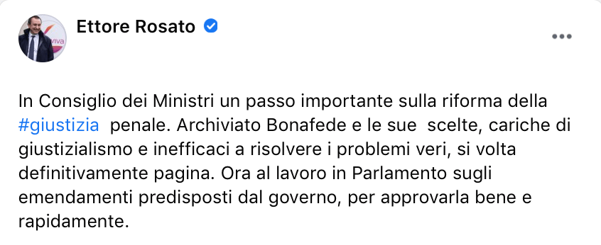 Nei giorni scorsi, una delle riforme approvate dal Governo riguarda la giustizia. Una buona notizia: viene archiviata per sempre la stagione Bonafede, il ministro del giustizialismo e del caos nelle carceri.
