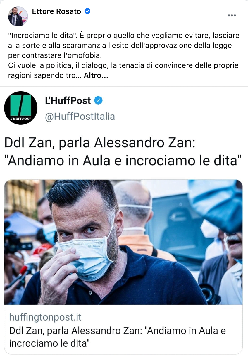 Domani inizierà in Senato la discussione sul DDL Zan. Sono ancora ottimista che si possa trovare un accordo per mettere in sicurezza l’approvazione della legge trovando una sintesi che allarghi la maggioranza in Parlamento (qui la mia intervista a Libero).
