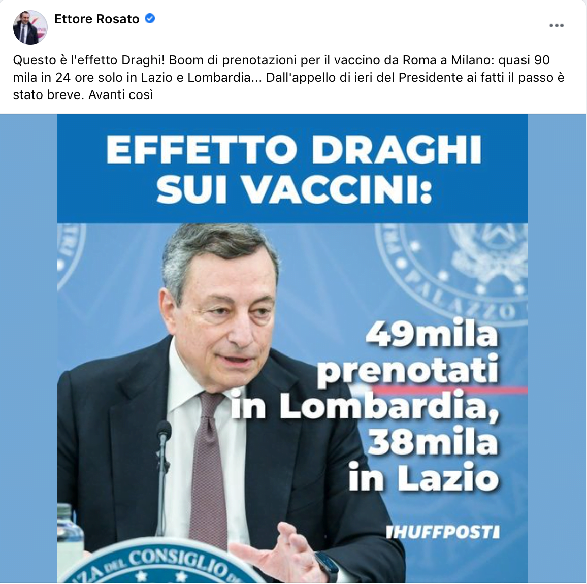 Ci sono tanti modelli positivi in questa campagna vaccinale, come Michele Mazzella, medico di Napoli, la cui foto ha fatto il giro del web (guarda qui). Ma anche la politica dovrebbe dare il buon esempio, credo che tutti i parlamentari in condizioni di salute per farlo dovrebbero vaccinarsi. Trovo assurdo che l’obbligo di green pass sia previsto per tante attività commerciali e non anche per entrare in Parlamento…