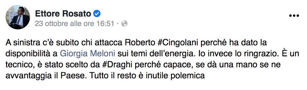 Grazie a Draghi, l’accordo europeo sul tetto al prezzo del gas ha ottenuto un immediato calo del costo sul mercato, restiamo fiduciosi su quanto l’Italia potrà fare ancora, anche grazie alla collaborazione di un tecnico esperto come l’ex ministro Cingolani. E criticarlo per essersi reso utile al Paese è un controsenso…